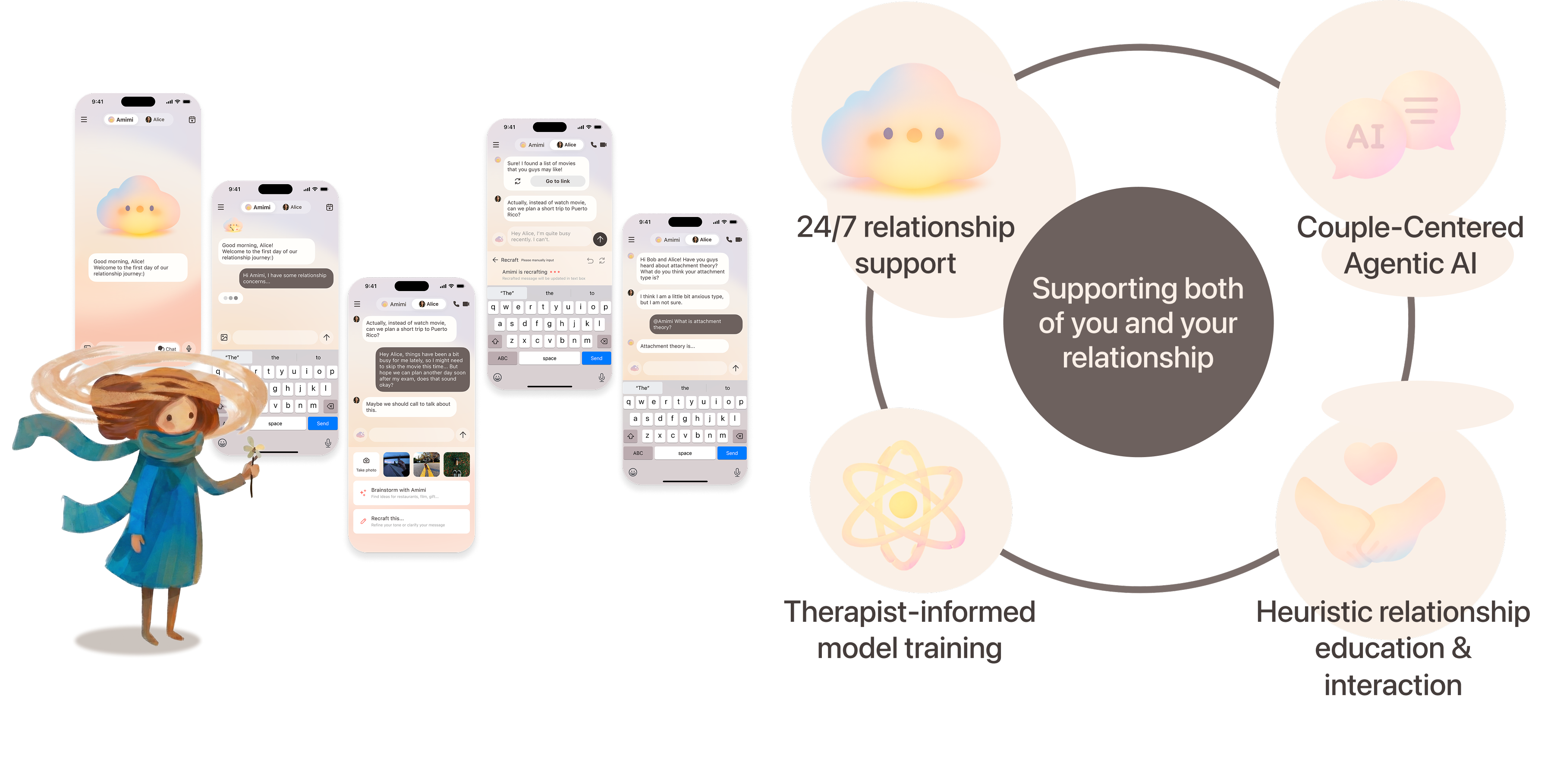 We believe love is beautiful and it is a journey of learning and growth - not a game of chance. Built with couple therapists and relationship coaches, Amimi dynamically supports both individual and joint interactions.